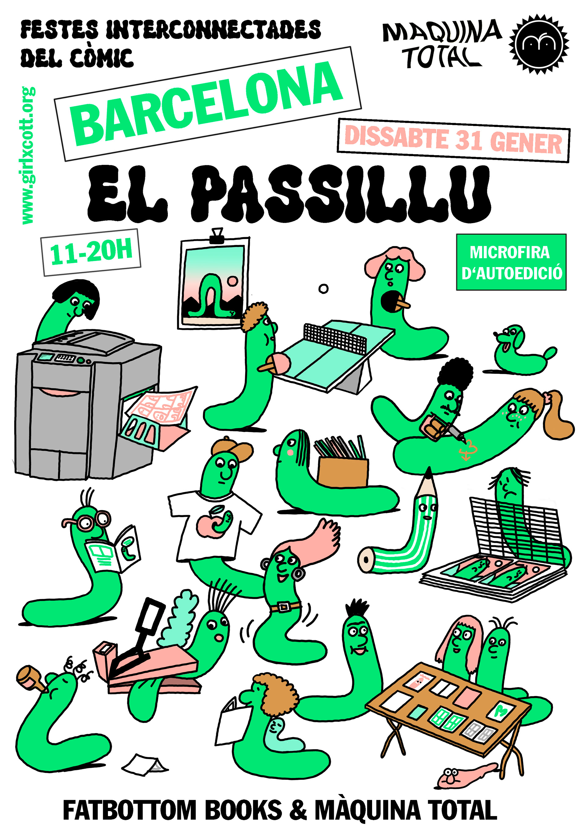 I made this poster for EL PASSILLU zine fair, an event in the context of the Girlxcott movement that celebrated decentralized comic events instead of the canceled FIBD Angoulême 2026. The PASSILLU took place in Fatbottom books in Barcelona, and the characters it features are inspired in Anouk Ricard's worm characters designed for the Girlxcott campaign.
